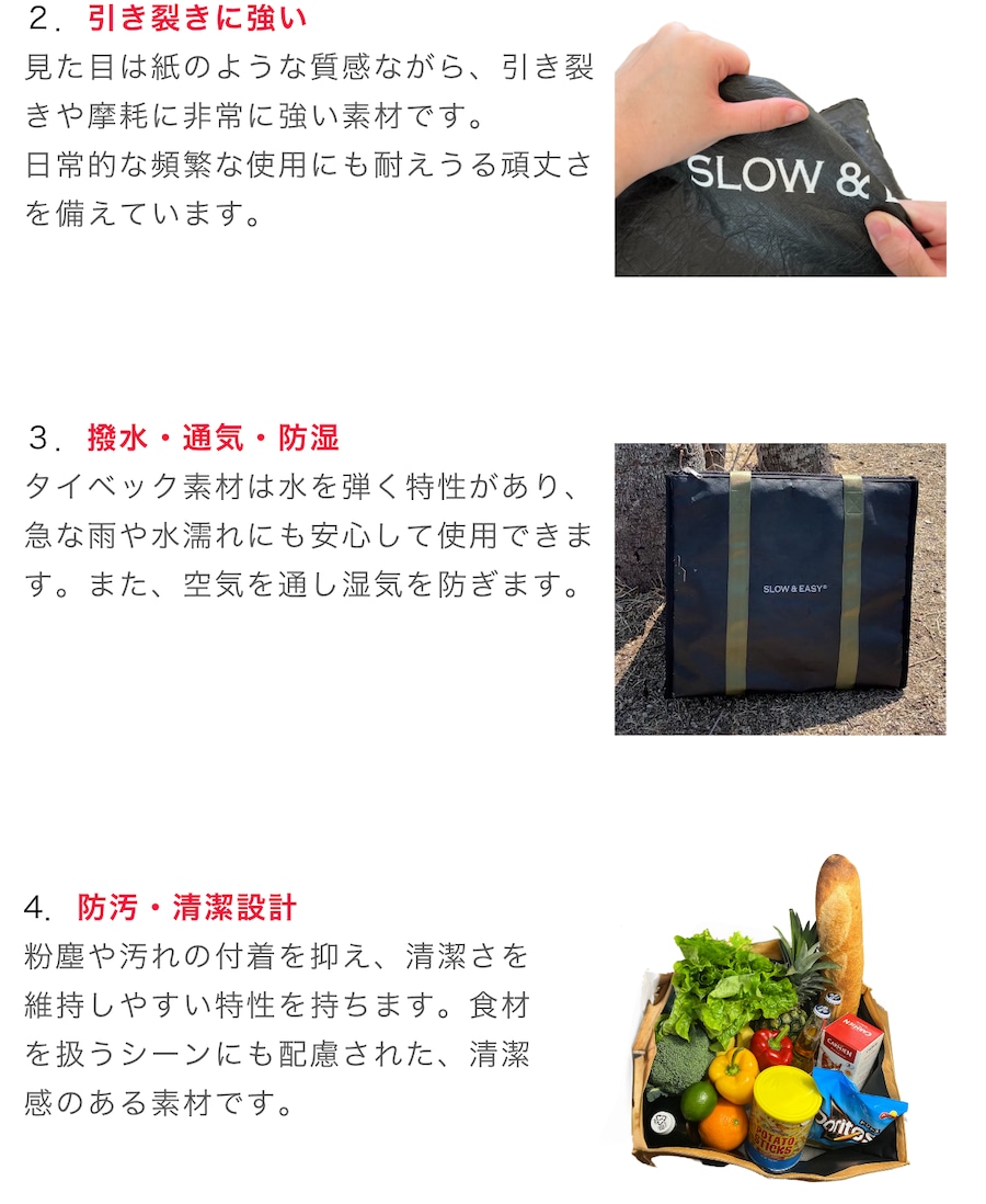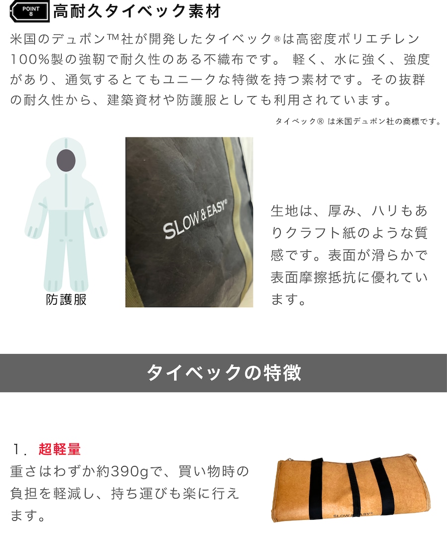 素材には、軽量・耐久・防水性に優れた「タイベック®」を採用。